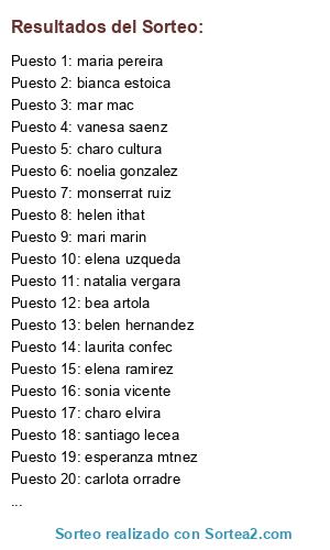 Lista de participantes: tipy eps, cristina saenz, davinia soloyo, elena uzqueda, naiara marquinez, belen hernandez, beatriz martinez, an nar luz, bianca estoica, elena ramirez, lucia uzqueda, ranita cano, jone zuluaga, mari mateo garceo, a. carmen saenz, pilar morales, leticia munilla, esther felipe, ana subero, ane ochoa, mar mac, gloria valerio, susana martinez, camino rromero, monserrat ruiz, mila odroizola, nievez ramirez, maria falces, gloria llanos, ana llanos, mirian perez, sonia vicente, beatriz blasco, m.mar mtnez, m.carmen ozcoz, ibana jesus, saraq armendariz, conchi varea, monica carbo, m.mar chamorro, esperanza mtnez, m.carmen jimenez, ana pg, victoria suberviola, asuncion blanco, sara rivas, monica janette, juan arete, anabel lizanzu, mirian garcia, m.fer duran, ana monroy, elizabet ardaiz, anisora bucur, susana esquerro, m.jose abad, gemma blanco, conchi saenz, patri pina, m.paz morentin, conchi gil, magdalena hertza, a.mari calvo, santiago lecea, m.pilar alfaro, natalia vergara, cristina garcia, charo elvira, monica baztan, maite fernandez, mirian suberviola, paqui bartolome, ramona fernandez, maria pereira, m.jusus izurzu, loli baraita, m. antonia barco, mikaela pija, ines mangado, monica ezquero, malefica luna, mari del moral, m.jose rio, lola jimenez, mari marin, adela fernandez, alice solver, ana vicioso, ana zubia, m.elena mir, charo cultura, mirian ripa, bea artola, garbiñe rueda, paqui ruiz, arantza perez, noelia gonzalez, legardi mtnez, vanesa saenz, itziar sadaba, isabel cepeda, ibana sagasti, helen ithat, laurita confec, carlota orradre, diana mardan, marta busto, ana busto, inma ezquerro, marta gurrea, tamar caro, raquel vazquez, marga matnez, nagore armendariz, noelia ochoa.
