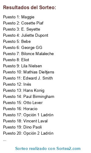 Lista de participantes: Bebe, Bilonce Malaleche, Cosette Piaf, Dino Paoli, E. Seyette, Edward J. Smith, Eliot, George GG, Grace Hayworth, Hans Konig, Horacio, Inés, Juliette Dupont, Lila Nielsen, Maggie, Matthew Bates, Mathias Dieltjens, Otto Lever, Paul Birmingham, Vincent Laval, Opción 1 Ladrón, Opción 2 Ladrón.