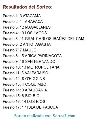 Lista de participantes: 1 TARAPACA, 2 ANTOFAGASTA, 3 ATACAMA, 4 COQUIMBO, 5 VALPARAISO, 6 O'HIGGINS, 7 MAULE, 8 BIO BIO, 9 ARAUCANIA, 10 LOS LAGOS, 11 GRAL CARLOS IBAÑEZ DEL CAMPO, 12 MAGALLANES, 13 METROPOLITANA, 14 LOS RIOS, 15 ARICA PARINACOTA, 16 SAN FERNANDO, 17 ISLA DE PASCUA.