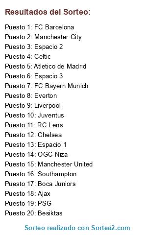 Lista de participantes: Ajax, Atletico de Madrid, Besiktas, Boca Juniors, Celtic, Chelsea, Everton, FC Barcelona, FC Bayern Munich, Juventus, Liverpool, Manchester City, Manchester United, OGC Niza, PSG, RC Lens, Southampton, Espacio 1, Espacio 2, Espacio 3.
