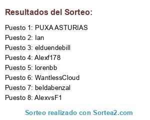 Lista de participantes: AlexvsF1, Alexf178, lorenbb, beldabenzal, PUXA ASTURIAS, elduendebill, WantlessCloud, Ian.