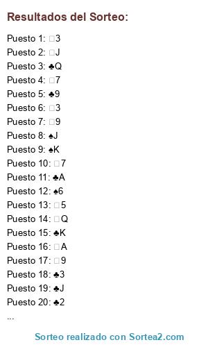 Lista de participantes: ♠2, ♠4, ♠6, ♠7, ♠8, ♠9, ♠10, ♠Q, ♠K, ♠A, ♡2, ♡3, ♡5, ♡6, ♡7, ♡8, ♡10, ♡J, ♡K, ♡A, ♣2, ♣3, ♣6, ♣8, ♣9, ♣10, ♣J, ♣Q, ♣K, ♣A, ♢2, ♢3, ♢4, ♢5, ♢7, ♢9, ♢10, ♢J, ♢Q, ♢K.