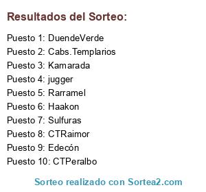 Lista de participantes: CTRaimor, Edecón, Sulfuras, Rarramel, CTPeralbo, Kamarada, DuendeVerde, Cabs.Templarios, jugger, Haakon.