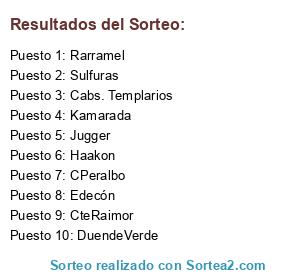 Lista de participantes: Cabs. Templarios, DuendeVerde, Haakon, Sulfuras, CPeralbo, Kamarada, CteRaimor, Edecón, Rarramel, Jugger.