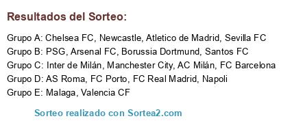 Lista de participantes: FC Real Madrid, Borussia Dortmund, Chelsea FC, Newcastle, Arsenal FC, Inter de Milán, PSG, Napoli, Manchester City, Valencia CF, Santos FC, Atletico de Madrid, AC Milán, Sevilla FC, FC Porto, FC Barcelona, Malaga, AS Roma.