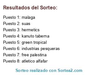 Lista de participantes: suas, industrias pesqueras, hermetics, malaga, green tropical, kanuto taberna, atletico alfafar, free palestina.