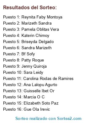 Lista de participantes: Sara Leidy , Marcia O C , Pamela Oblitas Vera , Sandra Marizeth , Guisselle Ibet Or , Katerin Chimoy , Ana Lalopu Agurto , Bf Sofy , Reynita Faby Montoya , Carolina Rodas de Ramires , Jenny Quiroja , Marizeth Sandra , Gue Ola Irevic , Briseyda Delgado , Patty Roque , Elizabeth Soto Paz , .