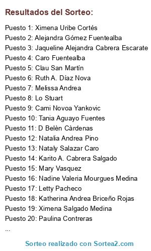 Lista de participantes: Carolina B. Guzmán Rogel, Cami Novoa Yankovic , Natalia Andrea Pino , Cami Quezada , Karen Hernández Luengo, Nataly Salazar Caro, Tania Aguayo Fuentes , Paolita Fer Nanda , Vivi Andrea Luengo, Coni Ruiz Zuñiga , María Belén López Salgado , Jeldres Ortiz, Carmen Gloria Morales Riveros, Anita Aguayo , Mary Vasquez , Patricia Gomez Heredia , Alejandra Gómez Fuentealba, Letty Pacheco , Paulina Contreras, Marisol Toloza , Melissa Andrea, Alexandra Llanos Araya, K-rito Arevalito Urrutia, Ruth A. Díaz Nova, Lore M Rodríguez , Belén Domínguez Figueroa, Chica Tejeda , D Belèn Càrdenas , Katherina Andrea Briceño Rojas , Ximena Uribe Cortés , Clau San Martín , Caro Fuentealba , Jaqueline Alejandra Cabrera Escarate, Melissa Osorio Constanzo , Nadine Valeria Mourgues Medina , Vivi Ortega F , Cami Jara, Mily Morales, Monserrat Olate Echeverria , Omy Pascual , Lo Stuart, Inge Gonzalez , Eva Diaz , Loreto Fernanda, Claau Castillo , Coca Ramírez, Ximena Salgado Medina , Claudia Krahmer , Karito A. Cabrera Salgado.
