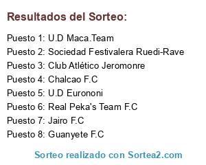 Lista de participantes: U.D Eurononi, Chalcao F.C, Club Atlético Jeromonre, Guanyete F.C, U.D Maca.Team, Real Peka's Team F.C, Jairo F.C, Sociedad Festivalera Ruedi-Rave.