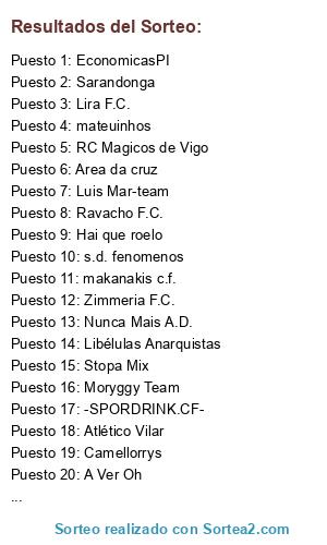 Lista de participantes: FC Estrela Vermelha, Moryggy Team, Antoñanes team, ThE jUeRiSnAi's, A Ver Oh, Area da cruz, s.d. fenomenos, makanakis c.f., EconomicasPI, Nunca Mais A.D., Gran RETROSKI, Atlético Vilar, Os Ártabros, Tyde F.C., Libélulas Anarquistas, Garrapateros CF, NECORIÑA, Sarandonga, -SPORDRINK.CF-, Hai que roelo, Zimmeria F.C., Luis Mar-team, perrusso v.f.c., RC Magicos de Vigo, Lito's F.C, Rias baixas F.C., Stopa Mix, Camellorrys, Lira F.C., Ravacho F.C., mateuinhos, Compostela S.A.D..