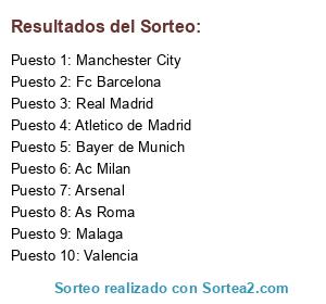 Lista de participantes: Arsenal, Real Madrid, Manchester City, Ac Milan, Bayer de Munich, Atletico de Madrid, Fc Barcelona, Malaga, As Roma, Valencia.