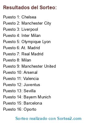 Lista de participantes: Barcelona, Real Madrid, Inter Milan, Milan, Chelsea, Manchester United, Manchester City, Arsenal, Bayern Munich, Sevilla, Valencia, Liverpool, Olympique Lyon, Juventus, Oporto, At. Madrid.