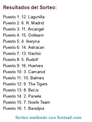 Lista de participantes: 1. Baratijos , 2. Panete , 3. Camarod, 4. Ikeryna, 5. Rudolf , 6. R. Madrid , 7. Nosfe Team , 8. Bet.is , 9. The Tigers , 10. Balmes, 11. Arcangel , 12. Lagunilla, 13. Nachio, 14. Astracan, 15. Golteam, 16. Huelves.