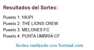 Lista de participantes: MELONES FC, NIUPI, PUNTA UMBRÍA CF, THE LIONS CREW.