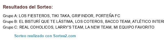 Lista de participantes: PORTEÑA FC, LA NEW TEAM, TIKI TAKA, LOS COTEROS, LOS FIESTEROS, ATLÉTICO INTERNACIONAL, GRIFINDOR, LARRY'S TEAM, REAL COHOLICOS, MI EQUIPO FAVORITO, EL BISTURÍ QUE TE LÁSTIMA, BACCO TEAM.