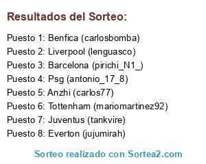 Lista de participantes: Liverpool (lenguasco), Everton (jujumirah), Psg (antonio_17_8), Benfica (carlosbomba), Juventus (tankvire), Tottenham (mariomartinez92), Anzhi (carlos77), Barcelona (pirichi_N1_).