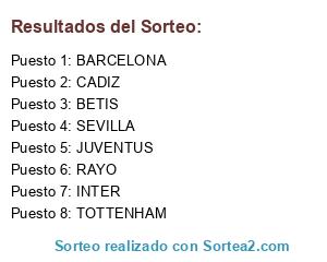 Lista de participantes: BETIS, JUVENTUS, TOTTENHAM, SEVILLA, BARCELONA, CADIZ, INTER, RAYO.