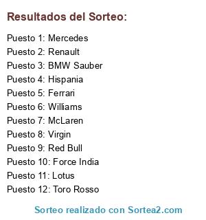 Lista de participantes: Red Bull, Ferrari, McLaren, Mercedes, Renault, Force India, Williams, Toro Rosso, BMW Sauber, Lotus, Hispania, Virgin.