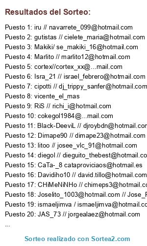 Lista de participantes: mescamilla, @Perdy_trs, @hintoni, @assalito, @er_makina1989, @osvaldito9, xXSeVi_STyLeXx, @dieguito_thebest, @lolito_er_crack, @chimeps3, @se_makiki_16, @david-olmedo, @imanol_martinez, vicente_el_mas, @navarrete_099, @israel_febrero, @cataproviciaos, luigi carras 89, @rubenyanes57, @michaelbacas, @rafana04, flakojmays, @jorgealaez, @fabro_3000, @cortex_xx, Sir Kaisser, @moisesito, @poletinho10, @ruben_bosch7, @zequi_pes, @Joselito_1003, @fernan_buco, @frias_01_liga, @dani_caseria, @iker-00, @roig.albert, @angelcop83, @ofabelo, @richi_89_16, @dj_trippy_sanfer, @daviddiaz81, @pabloartista, @richi_i, @djroybdn, @pipo_erica, @joselete11, @charly_shanero, @cielete_maria, @josee_vlc_91, @xdominx, @cokegol1984, @pichichi_neng, @marcgava, @sete781, @jesus_roney9, @dga_8, @manine_palma, @francis15pes, @ismaeljimva, @dimape23, beivi98 - beivi92hotmail.com, @iban_grao, @ruben_gv_69, @bcq_85_, @xori_12, @david.tillo, @soyuntangao, @fitipaldi_76, @jordiblay_93, @egidopau, @marlito12, @ravenn8, @sandovaliyo_87, Fantasma_Loko, @harrytxu, @amirdergic, @luis___1983, @amaro1982, @tistofer_3, @competicionespesps3.