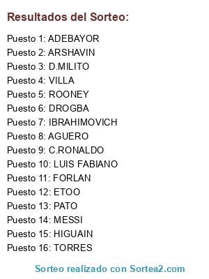 Lista de participantes: C.RONALDO, MESSI, IBRAHIMOVICH, DROGBA, TORRES, LUIS FABIANO, ETOO, ROONEY, AGUERO, D.MILITO, FORLAN, ARSHAVIN, VILLA, PATO, HIGUAIN, ADEBAYOR.