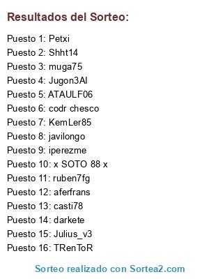 Lista de participantes: codr chesco, Petxi, Jugon3AI, ruben7fg, muga75, casti78, TRenToR, Shht14, x SOTO 88 x, iperezme, Julius_v3, aferfrans, KemLer85, ATAULF06, darkete, javilongo.