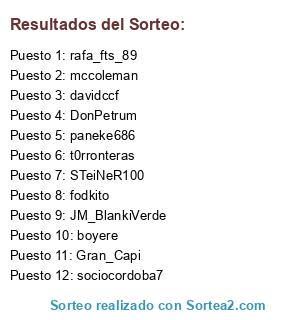 Lista de participantes: t0rronteras, boyere, sociocordoba7, paneke686, JM_BlankiVerde, rafa_fts_89, Gran_Capi, mccoleman, DonPetrum, davidccf, STeiNeR100, fodkito.
