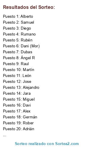 Lista de participantes: Germán, Dubas, Rubén R, Ángel R, Raul, Abel, Alex, Rubén, Dani (Mor), Davi, Adrián, Rober, Alejandro, Alberto, Jesus, Miguel, Jose, Martín, Diego, Samuel, León, Jara, Pablo, Rumano, Mayorgas, Jorge.