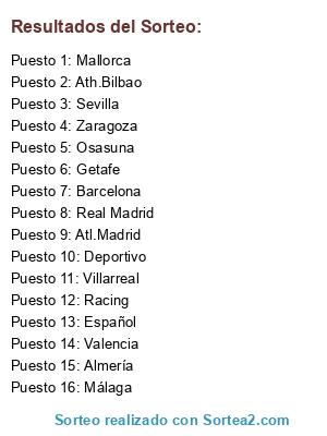 Lista de participantes: Villarreal, Ath.Bilbao, Real Madrid, Almería, Atl.Madrid, Málaga, Valencia, Getafe, Osasuna, Mallorca, Barcelona, Zaragoza, Sevilla, Español, Racing, Deportivo.