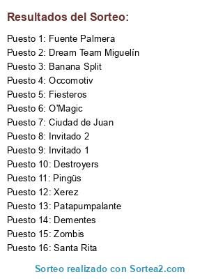 Lista de participantes: Fuente Palmera, Zombis, Dementes, O'Magic, Xerez, Dream Team Miguelín, Pingüs, Banana Split, Occomotiv, Patapumpalante, Santa Rita, Ciudad de Juan, Fiesteros, Destroyers, Invitado 1, Invitado 2.