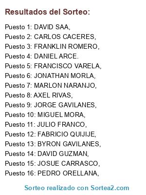 Lista de participantes: PEDRO ORELLANA,, JONATHAN MORLA,, FABRICIO QUIJIJE,, JULIO FRANCO,, CARLOS CACERES,, DAVID GUZMAN,, DAVID SAA,, JORGE GAVILANES,, BYRON GAVILANES,, MIGUEL MORA,, MARLON NARANJO,, JOSUE CARRASCO,, FRANCISCO VARELA,, AXEL RIVAS,, FRANKLIN ROMERO,, DANIEL ARCE..