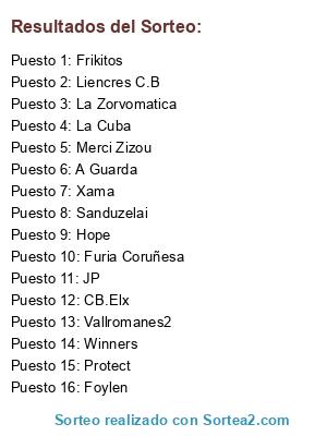 Lista de participantes: La Cuba, Furia Coruñesa, Winners, CB.Elx, Protect, Foylen, La Zorvomatica, Vallromanes2, Merci Zizou, Liencres C.B, JP, Xama, A Guarda, Frikitos, Hope, Sanduzelai.