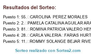 Lista de participantes: 1. MARGARITA PAOLA ADASME YÁÑEZ, 2. PAMELA CATALINA AGUILAR ARANCIBIA, 3. NATALIA AGUILERA ZAMORA, 4. FRANCISCO JESUSAGURTO ARANCIBIA, 5. NELSON ALEJANDRO AMARIO PULGAR, 6. NATALY DANIELA AMPUERO CORRALES, 7. MARCOS ERNESTO ARAVENA CUEVAS, 8. KATHERINE ROMINA ARAYA ALLENDES, 9. LICCETTI CAMILAASTUDILLO BRITO, 10. FABIOLA MACARENA AVENDAÑO HERRERA, 11. ROMMY SOLANGE BEJAR RIVERA, 12. CRISTIAN BRAVO ROMÁN, 13. BLANCA ESTELA DE MARÍA BURGOS GUAJARDO, 14. KARINA VALEZCA CABRERA PEREZ, 15. NATALIA CECILIA CARRASCO BRAVO, 16. CARLA ROMINA CARRASCO CASTRO, 17. NOLBERTO JAVIER CASTILLO JEREZ, 18. ROSA LIANA CATALÁN MARÍN, 19. TAMAR ANDREA CATALÁN ROCCO, 20. YOCELYN ARACELY CATALÁN SOLAR, 21. TEXIA ANDREA CORDOVA PEÑA, 22. JULY ANDREA CORTES BRICEÑO, 23. RITA ANDREA CUEVAS VALDES, 24. MYKY BRYAN DEL CASTILLO MATTU, 25. LILIAN PABLINA DÍAZ GONZÁLEZ, 26. ANDRES HERNAN DIAZ PASTEN, 27. JOSÉ ORLANDO DONOSO SEPÚLVEDA, 28. CARLA VALERIA FARIAS HURTUBIA, 29. ROSA DEL CARMEN GARRIDO MORALES, 30. NICOLE ANDREA GIUSTO CASTRO, 31. PAZ BELEN GONZALEZ DELGADO, 32. TANIA ANDREA GONZÁLEZ LAZO, 33. LORENA GONZÁLEZ SAAVEDRA, 34. PAULA YANIRA GUTIÉRREZ GONZÁLEZ, 35. SERGIO ANTONIO HERNANDEZ GUZMAN, 36. MANUEL ALEJANDRO HEVIA NUÑEZ, 37. MAHATMA HASSAN JAIDAR MESINA, 38. LIZBETH ELIZABETH JEREZ FERNANDEZ, 39. JAIME LEIVA, 40. PABLO ALONSO LEYTON MATELUNA, 41. VALERIA FRANCISCA LIZANA VARGAS, 42. ANA MARÍA LLACH LARRAÍN, 43. DOMINGO ANDRÉS LÓPEZ JERIA, 44. ALEJANDRA DEL PILAR LOPEZ MORA, 45. JORGE GAONA, 46. FABIOLA ANDREA MALLA MALLA, 47. CARLA ROMINA MANQUI MUNDACA, 48. CAMILA PATRICIA MAUREIRA CERDA, 49. XIMENA MARLENE MIRANDA CUZ, 50. KARIMA ANDREA MOLINA OTÁROLA, 51. PAULA ANDREA MORALES COVARRUBIAS, 52. HERNÁN OLIVARES RAMÍREZ, 53. BASTIAN MAXIMILIANO OLMOS MAUREIRA, 54. YANIRA ESTEFANY PALMA NÙÑEZ, 55. CAROLINA PEREZ MORALES, 56. NATHALIE PUENTE PULGAR, 57. GLADYS PAMELA REYES GONZALEZ, 58. CAMILA REYES LILLO, 59. VIVIANA ANDREA ROCHE SILVA, 60. XIMENA EMELINA ROJAS BUFFO, 61. PATRICIO ADRIÁN ROJAS ORREGO, 62. ROMELIO SAAVEDRA VARGAS, 63. YASNA KARINA SANDOVAL OJEDA, 64. JIMENA IVONNE SANHUEZA MANSILLA, 65. JOSEFA SCHULBACH, 66. MARIA JOSE SEPULVEDA MOLINA, 67. JUAN CARLOS SILVA ARMIJO, 68. JONATHAN ALEXIS SILVA CARCAMO, 69. CLAUDIA KARINA SILVA MIRANDA, 70. KARINA ANDREA SOTO PALMA, 71. SEBASTIÁN SOTO, 72. CASANDRA LISSETE SUÁREZ GONZÁLES, 73. HUGO EDUARDO TOLEDO AVALOS, 74. CARLOS EDUARDO TOLMO PÉREZ, 75. GONZALO ABEL TORRES GUERRERO, 76. KATHERINE TRIGO PIZARRO, 77. EVELYN MIREYA TRONCOSO VILLARROEL, 78. HERNÁN VALENZUELA, 79. MAURICIO EDUARDO VALENZUELA AHUMADA, 80. ROXANA VALENZUELA FLORES, 81. ROMINA PATRICIA VALERO HENRIQUEZ, 82. MARYANGELA VARGAS BÁEZ, 83. ROSA VALESKA VÁSQUEZ ABARCA, 84. YASNA SOLEDAD VEGA CARDENA, 85. MARÍA PAZ VERDEJO GAETE, 86. JUAN ISMAEL VERGARA PUEBLA, 87. RUTH ELIZABETH ZAMORANO BENITEZ, 88. PATRICIA VALDES, 89. ANDREA SÀNCHEZ LÒPEZ, 90. ANGELICA SANCHEZ PÈREZ, 91. SEBASTIÁN SOTO VERA, 92. GUSTAVO ZAMORA FIGUEROA, 93. JAIME LEIVA NÚÑEZ, 94. HERNÁN VALENZUELA, 95. LUIS GALLARDO ASTUDILLO.