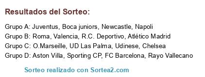 Lista de participantes: Newcastle, Juventus, UD Las Palma, Chelsea, Sporting CP, Rayo Vallecano, R.C. Deportivo, Napoli, Aston Villa, Atlético Madrid, O.Marseille, Udinese, FC Barcelona, Valencia, Boca juniors, Roma.