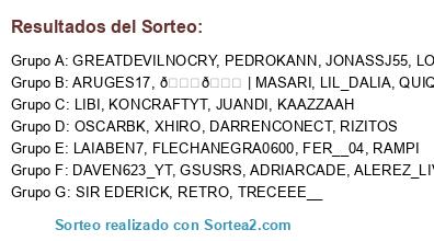 Lista de participantes: SIR EDERICK, OSCARBK, JONASSJ55, FER__04, 𝐖𝐏 | MASARI, DAVEN623_YT, PEDROKANN, FLECHANEGRA0600, RETRO, ALEREZ_LIVES, KAAZZAAH, LIL_DALIA, GREATDEVILNOCRY, KONCRAFTYT, LAIABEN7, DARRENCONECT, RAMPI, GSUSRS, TRECEEE__, ADRIARCADE, QUIQUEVITA, JUANDI, ARUGES17, LIBI, RIZITOS, LOIS, XHIRO.