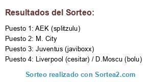 Lista de participantes: AEK (splitzulu), M. City, Juventus (javiboxx), Liverpool (cesitar) / D.Moscu (bolu).