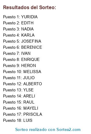Lista de participantes: HERON (20 participaciones), JULIO (20 participaciones), IVAN (13 participaciones), YURIDIA (13 participaciones), KARLA (11 participaciones), MELISSA (11 participaciones), NADIA (11 participaciones), BERENICE (10 participaciones), ENRIQUE (9 participaciones), EDITH (7 participaciones), RAUL (7 participaciones), ARELI (5 participaciones), JOSEFINA (4 participaciones), PRISCILA (4 participaciones), LUIS (3 participaciones), YLSE (3 participaciones), MAYELI (3 participaciones), ALBERTO , ALBERTO.