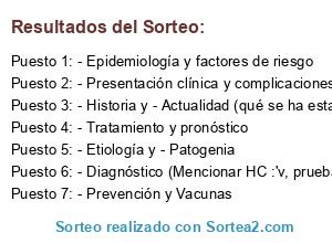 Lista de participantes: - Historia y - Actualidad (qué se ha estado haciendo, medidas, pronósticos, antivacunas, situación del país, etc.), - Epidemiología y factores de riesgo, - Etiología y - Patogenia, - Presentación clínica y complicaciones, - Diagnóstico (Mencionar HC :'v, pruebas rápidas, moleculares, ayuda imagenológica, también para evaluar las complicaciones), - Tratamiento y pronóstico, - Prevención y Vacunas.