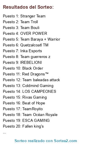 Lista de participantes: """Legión Utopía""" , ⭐ THC ©®™⭐ , 3Rules Gaming , Argentina2 , ARUPAKA , Astral Esports B , Ayllus Perú LD , Beat of Hope , Black Order , Brazzers.Bo , Caballeros eSport , Clash Perú pro , Coldmind Gaming , Costa Rica Drak , CRM Lions™ , Ecuakings , ESCA GAMING , Fallen king's , GhostOrange , GODS⭐LADDER , Golden Hinds , Gunners eSports , Hell Riders , Horse Crimsom , Infernus Team , Infinity gaming , Inka Esports , Juanones FC , Khaos Esports , KILLER KINGS 🇵🇪 , LA GRAN CAMPAÑA , Lailitos , Latino's Army , Legacy eSports , Lethal eSports , Little máster , LOS CAMPEONES , LOS ELEGIDOS , lREBELIONl , M.D.I SPORTS , Majestic E-Sport , Monster RV , NeverGiveUp , OVER POWER , Pika! eSports , Platanitos eSports , POISON GAMING , Primos volados , Quetzalcoatl TM , Raiders Academy , Real Kings , Red Dragons™ , Revenge eSports , Rivas Gaming , Rojo Carmesí , Royalblood , Solera Verde , Space Walker , STAR FLAME , Stranger Team , Suns Esports , Tahuantinsuyo , Team Águila , Team baleadas attack , Team Baraya + Warrior , Team Bouli , Team buscadores , TEAM ETERNITY , Team Godzilla Nic , TEAM GUERRERO , Team guerreros z , Team Lower's RG , Team Océan Royale , TEAM QUESITO , Team Rhinos , Team roll royce , TEAM ROYAL , Team Troll , TeamRoyito , Tex variedades , Tiger Esport™ , TIGRES , Titanes Esports , Toxic Warriors , Unique Legacy , United Legends , Wings eSports.