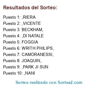 Lista de participantes: BECKHAM,, CAMORANESSI,, WRITH PHILIPS,, JOAQUIN,, FOGGIA, ,PARK JI SUN, ,DI NATALE, ,NANI, ,VICENTE, ,RIERA.