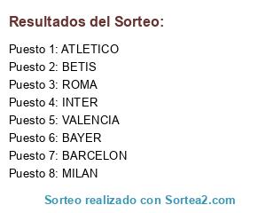 Lista de participantes: BAYER, BETIS, ROMA, ATLETICO, MILAN, VALENCIA, INTER, BARCELON.