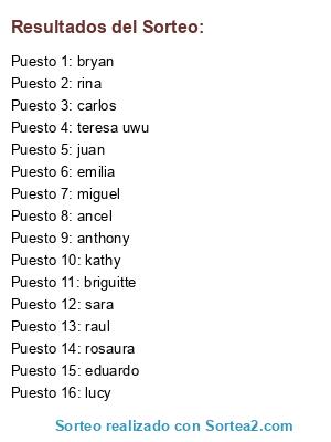 Lista de participantes: bryan, emilia, ancel, sara, raul, juan, rosaura, anthony, rina, kathy, carlos, lucy, briguitte, eduardo, teresa uwu, miguel.