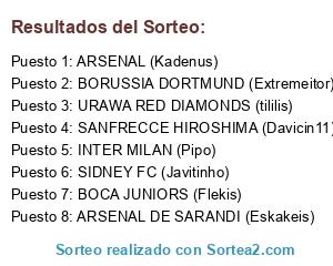 Lista de participantes: BOCA JUNIORS (Flekis), ARSENAL DE SARANDI (Eskakeis), BORUSSIA DORTMUND (Extremeitor), INTER MILAN (Pipo), ARSENAL (Kadenus), SANFRECCE HIROSHIMA (Davicin11), URAWA RED DIAMONDS (tililis), SIDNEY FC (Javitinho).
