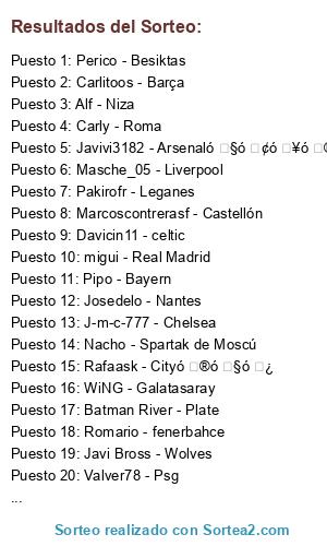 Lista de participantes: Vanvicen14 - Milan, Javivi3182 - Arsenal, Simarro_13 - Juventus, migui - Real Madrid, Rafaask - City, Sepukill - Inter Milan, Equalofficial - Fiorentina, D4v1d_f3n1x - betis, Alf - Niza, Pipo - Bayern, Javi Bross - Wolves, Pakirofr - Leganes, Valver78 - Psg, Carly - Roma, Josedelo - Nantes, Davicin11 - celtic, Batman River - Plate, Romario - fenerbahce, Marcoscontrerasf - Castellón, Ayusosad - Rennes, J-m-c-777 - Chelsea, Masche_05 - Liverpool, Perico - Besiktas, WiNG - Galatasaray, Pelotazos - Parma, Carlitoos - Barça, Nacho - Spartak de Moscú, Salva - Valencia.