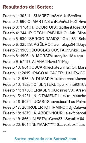Lista de participantes: 20 ROBERTO FIRMINO Dj Calavera xXx Everton, 33 A. SCHURRLE perikinho90 Cordoba, 41 M. NEUER KaOs I AsTuR Oviedo, 43 J. BOATENG echateunfifa Ol. Marsella, 45 P. LAHM alead71 Tottenham, 48 A. ROBBEN**** victub Valencia, 49 T. MULLER o0 Sergi 0o Zaragoza, 50 F. RIBERY alexhdz Fiorentina, 57 D. ALABA Havel7 Psg, 62 M. HUMMELS ChaoticHornet67 Toronto, 66 M. GOTZE P3drito Sion, 74 R. LEWANDOWSKI Havel7 Psg, 79 M. REUS SIN GAMER SIN EQUIPO, 81 R. PEREYRA sergiotabascos89 Manchester United, 90 K. BELLARABI Alex1493 Napoles, 155 SOKRATIS ferminnn Nantes, 156 NALDO Saavexbox Las Palmas, 244 P. CECH PABLINHO Ath. Bilbao, 252 D. STURRIDGE MrMohamRam Liverpool, 254 MATA sergiotabascos89 Manchester United, 256 DAVID LUIZ misterserpico West Ham, 264 R. LUKAKU andrey8y8 Oporto, 279 P. POGBA Balles Malmoe, 305 L. SUAREZ xSAMU Benfica, 316 V. KOMPANY victub Valencia, 319 Y. TOURE alead71 Tottenham, 321 DAVID SILVA benniscuba Roma, 323 S. AGÜERO alemalaga94 Bayern Munich, 324 C. TEVEZ moiaguilera Orlando City, 334 Y. KONOPLYANKA Red Dutti B. Leverkusen, 337 DE GEA gabripf Cristal Palace, 346 W. ROONEY Ergion46 Monaco, 347 J. HERNANDEZ Shaman1987 Red Bulls, 378 A. TAARABT trompexbox360 Chicago Fire, 414 L. MODRIC trompexbox360 Chicago Fire, 415 G. BALE adrylito Malaga, 433 C. BEAUVUE ulimoreno Juventus, 471 A. RAMSEY SrPistolas86 Udinese, 473 T. WALCOTT Saavexbox Las Palmas, 474 R. VAN PERSIE CometHeaven79 Chelsea, 477 L. KOSCIELNY sergiotabascos89 Manchester United, 478 J. WILSHERE misterserpico West Ham, 496 A. MARTIAL TheForceMaker Alcorcon, 584 OSCAR echateunfifa Ol. Marsella, 604 NEYMAR**** Saavexbox Las Palmas, 609 LUCAS Saavexbox Las Palmas, 635 S. DOUMBIA Goss83 Schalke 04, 660 O. MARTINS x iReViiVal FoX River, 727 E. HAZARD merayombasogo Ponferradina, 741 L. REMY Red Dutti B. Leverkusen, 754 H. LLORIS sergiotabascos89 Manchester United, 775 J. PASTORE iGosling V9 Arsenal, 778 S. SIRIGU javitr Manchester City, 832 MUNIAIN Ramillos666 Alaves, 844 FALCAO SrPistolas86 Udinese, 845 A. TURAN gabripf Cristal Palace, 846 D. GODIN tabascos89 Barcelona, 853 DIEGO COSTA alemalaga94 Bayern Munich, 861 PIQUE SpiffiestJose Ol. Lyon, 863 SERGIO BUSQUETS StormFury elche, 865 CESC FABREGAS iRandy V8 Boca Juniors, 866 INIESTA Goss83 Schalke 04, 867 L. MESSI PABLINHO Ath. Bilbao, 871 A. SANCHEZ joselitorojas1 Wolsfburgo, 872 THIAGO Ivanxio Sounders, 873 PEDRO Shaman1987 Red Bulls, 900 SANTI CAZORLA moiaguilera Orlando City, 904 S. RONDON x chachiquesi x Betis, 906 ISCO**** iRandy V8 Boca Juniors, 930 SERGIO RAMOS Goss83 Schalke 04, 933 MARCELO Adriantr127 Atco. Madrid, 934 XABI ALONSO Ivanxio Sounders, 936 A. DI MARIA ulimoreno Juventus, 937 CRISTIANO RONALDO Saavexbox Las Palmas, 938 M. OZIL pinolines Sevilla, 939 K. BENZEMA javitr Manchester City, 943 G. HIGUAIN MrMohamRam Liverpool, 948 JOSE CALLEJON StormFury elche, 979 I. RAKITIC xSAMU Benfica, 999 JORDI ALBA Saavexbox Las Palmas, 1028 THIAGO SILVA sergiotabascos89 Manchester United, 1035 Z. IBRAHIMOVIC TATO XD Depor, 1075 A. CANDREVA javitr Manchester City, 1118 W. SNEIJDER SIN GAMER SIN EQUIPO, 1136 G. CHIELLINI Dj Calavera xXx Everton, 1138 A. VIDAL Shaman1987 Red Bulls, 1147 C. MARCHISIO pinolines Sevilla, 1185 CAVANI CometHeaven79 Chelsea, 1217 M. PJANIC pinolines Sevilla, 1251 N. OTAMENDI javitr Manchester City, 1255 HULK x chachiquesi x Betis, 1259 JAMES RODRIGUEZ**** misterserpico West Ham, 1331 K. DE BRUYNE alexfcbarcelona B. Dortmund, 1426 J. CUADRADO TheForceMaker Alcorcon, 1524 PHILIPPE COUTINHO AndrewTorres Real Sociedad, 1610 N. MATIC CometHeaven79 Chelsea, 1619 P. AUBAMEYANG**** borjitusss17 Ajax, 1668 D. MERTENS joselitorojas1 Wolsfburgo, 1729 PIRLO gabripf Cristal Palace, 1730 ERIKSEN iGosling V9 Arsenal, 1732 JACKSON MARTINEZ sergiotabascos89 Manchester United, 1750 RAMIRES SIN GAMER SIN EQUIPO, 1753 KROOS sergiotabascos89 Manchester United, 1755 C. VELA**** SpiffiestJose Ol. Lyon, 1756 WITSEL trunks Levante, 1757 GUNDOGAN danygp89 Bournomenth, 1758 R. NAINGGOLAN benniscuba Roma, 1784 T. COURTOIS SpiffiestJose Ol. Lyon, 1797 MATUIDI Ergion46 Monaco, 1803 R. STERLING SrPistolas86 Udinese, 1822 M. VERRATTI**** sergiotabascos89 Manchester United, 1825 C. BENTEKE perikinho90 Cordoba, 1826 R. VARANE sergiotabascos89 Manchester United, 1840 WILLIAN alexfcbarcelona B. Dortmund, 1842 KOKE toni1708 Celta, 1852 MARQUINHOS Pyra el Capo Angeles Galaxy, 1858 B. LENO alemalaga94 Bayern Munich, 1879 A. ABDENNOUR alexfcbarcelona B. Dortmund, 1888 A. LACAZETTE Pyra el Capo Angeles Galaxy, 1906 A. MORATA adrylito Malaga, 1907 A. GRIEZMANN adrylito Malaga, 1933 P. DYBALA HaLiToxGCFx Granada, 1969 DOUGLAS COSTA trunks Levante, 1994 DEPAY Red Dutti B. Leverkusen, 2010 C. BACCA Ergion46 Monaco, 2015 PACO ALCACER HaLiToxGCFx Granada, 2017 L. VIETTO Albervil Rayo Vallecano, 2030 A. LAPORTE KaOs I AsTuR Oviedo.