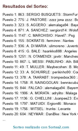 Lista de participantes: 20 ROBERTO FIRMINO Juanpee23 Everton, 33 A. SCHURRLE perikinho90 Cordoba, 41 M. NEUER KaOs I AsTuR Oviedo, 43 J. BOATENG echateunfifa Ol. Marsella, 45 P. LAHM alead71 Tottenham, 48 A. ROBBEN NandoBel78 Real Madrid, 49 T. MULLER Maybecohen B. Moenchengladbad, 50 F. RIBERY alexhdz Fiorentina, 57 D. ALABA Havel7 Psg, 62 M. HUMMELS ChaoticHornet67 Norwich City, 66 M. GOTZE natadp Lugo, 74 R. LEWANDOWSKI pinolines Sevilla, 79 M. REUS Adriantr127 Atco. Madrid, 81 R. PEREYRA AndrewTorres Real Sociedad, 90 K. BELLARABI javitr Manchester City, 155 SOKRATIS ferminnn Nantes, 156 NALDO n0jan Cristal Palace, 244 P. CECH PABLINHO Ath. Bilbao, 252 D. STURRIDGE MrMohamRam Liverpool, 254 MATA kikemedi99 Oporto, 256 DAVID LUIZ misterserpico West Ham, 264 R. LUKAKU kikemedi99 Oporto, 279 P. POGBA Balles Malmoe, 305 L. SUAREZ xSAMU Benfica, 316 V. KOMPANY victub Valencia, 319 Y. TOURE Shaman1987 Cska, 321 DAVID SILVA zzzz jona zzzz Boca Juniors, 323 S. AGÜERO alemalaga94 Bayern Munich, 324 C. TEVEZ Nurhio Orlando City, 334 Y. KONOPLYANKA xSAMU Benfica, 337 DE GEA n0jan Cristal Palace, 346 W. ROONEY Ergion46 Monaco, 347 J. HERNANDEZ ulimoreno Juventus, 378 A. TAARABT trompexbox360 Aston Villa, 414 L. MODRIC trompexbox360 Aston Villa, 415 G. BALE haankko888 Angeles Galaxy, 433 C. BEAUVUE Ergion46 Monaco, 471 A. RAMSEY SrPistolas86 Udinese, 473 T. WALCOTT El Patron I7I Sp. Lisboa, 474 R. VAN PERSIE CometHeaven79 Chelsea, 477 L. KOSCIELNY sergiotabascos89 Manchester United, 478 J. WILSHERE danygp89 Bournomenth, 496 A. MARTIAL TheForceMaker Alcorcon, 584 OSCAR echateunfifa Ol. Marsella, 604 NEYMAR DaniBke New York City, 609 LUCAS Saavexbox Las Palmas, 635 S. DOUMBIA Goss83 Schalke 04, 660 O. MARTINS Shaman1987 Cska, 727 E. HAZARD adrylito Malaga, 741 L. REMY pececillo1977 Ajax, 754 H. LLORIS alexhdz Fiorentina, 775 J. PASTORE zzzz jona zzzz Boca Juniors, 778 S. SIRIGU ChaoticHornet67 Norwich City, 832 MUNIAIN Ramillos666 Alaves, 844 FALCAO alemalaga94 Bayern Munich, 845 A. TURAN Albervil Rayo Vallecano, 846 D. GODIN Albervil Rayo Vallecano, 853 DIEGO COSTA sergiotabascos89 Manchester United, 861 PIQUE SpiffiestJose Ol. Lyon, 863 SERGIO BUSQUETS StormFury elche, 865 CESC FABREGAS benniscuba Roma, 866 INIESTA pececillo1977 Ajax, 867 L. MESSI PABLINHO Ath. Bilbao, 871 A. SANCHEZ sergiord14 Wolsfburgo, 872 THIAGO Ivanxio Sounders, 873 PEDRO SIN GAMER, 900 SANTI CAZORLA Nurhio Orlando City, 904 S. RONDON x chachiquesi x Betis, 906 ISCO misterserpico West Ham, 930 SERGIO RAMOS Goss83 Schalke 04, 933 MARCELO Adriantr127 Atco. Madrid, 934 XABI ALONSO Kenstall Napoles, 936 A. DI MARIA ulimoreno Juventus, 937 CRISTIANO RONALDO StormFury elche, 938 M. OZIL pinolines Sevilla, 939 K. BENZEMA Kenstall Napoles, 943 G. HIGUAIN MrMohamRam Liverpool, 948 JOSE CALLEJON StormFury elche, 979 I. RAKITIC xSAMU Benfica, 999 JORDI ALBA alemalaga94 Bayern Munich, 1028 THIAGO SILVA alead71 Tottenham, 1035 Z. IBRAHIMOVIC TATO XD Depor, 1075 A. CANDREVA MrMohamRam Liverpool, 1118 W. SNEIJDER NandoBel78 Real Madrid, 1136 G. CHIELLINI Juanpee23 Everton, 1138 A. VIDAL merayombasogo Ponferradina, 1147 C. MARCHISIO Havel7 Psg, 1185 CAVANI CometHeaven79 Chelsea, 1217 M. PJANIC Balles Malmoe, 1251 N. OTAMENDI javitr Manchester City, 1255 HULK x chachiquesi x Betis, 1259 JAMES RODRIGUEZ iGosling V9 Arsenal, 1331 K. DE BRUYNE alexfcbarcelona B. Dortmund, 1426 J. CUADRADO TheForceMaker Alcorcon, 1524 PHILIPPE COUTINHO AndrewTorres Real Sociedad, 1610 N. MATIC CometHeaven79 Chelsea, 1619 P. AUBAMEYANG benniscuba Roma, 1668 D. MERTENS sergiord14 Wolsfburgo, 1729 PIRLO El Patron I7I Sp. Lisboa, 1730 ERIKSEN zzzz jona zzzz Boca Juniors, 1732 JACKSON MARTINEZ AndrewTorres Real Sociedad, 1750 RAMIRES sergiotabascos89 Manchester United, 1753 KROOS tabascos89 Barcelona, 1755 C. VELA Ivanxio Sounders, 1756 WITSEL trunks Levante, 1757 GUNDOGAN danygp89 Bournomenth, 1758 R. NAINGGOLAN benniscuba Roma, 1784 T. COURTOIS SpiffiestJose Ol. Lyon, 1797 MATUIDI Ergion46 Monaco, 1803 R. STERLING SrPistolas86 Udinese, 1822 M. VERRATTI HaLiToxGCFx Granada, 1825 C. BENTEKE perikinho90 Cordoba, 1826 R. VARANE sergiotabascos89 Manchester United, 1840 WILLIAN SrPistolas86 Udinese, 1842 KOKE toni1708 Celta, 1852 MARQUINHOS tabascos89 Barcelona, 1858 B. LENO merayombasogo Ponferradina, 1879 A. ABDENNOUR alexfcbarcelona B. Dortmund, 1888 A. LACAZETTE Saavexbox Las Palmas, 1906 A. MORATA adrylito Malaga, 1907 A. GRIEZMANN x iReViiVaL FoX River Plate, 1933 P. DYBALA HaLiToxGCFx Granada, 1969 DOUGLAS COSTA trunks Levante, 1994 DEPAY Red Dutti B. Leverkusen, 2010 C. BACCA ferminnn Nantes, 2015 PACO ALCACER toni1708 Celta, 2017 L. VIETTO x iReViiVaL FoX River Plate, 2030 A. LAPORTE KaOs I AsTuR Oviedo.