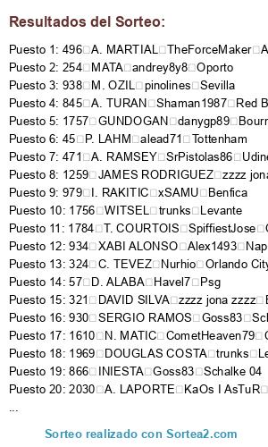 Lista de participantes: 20 ROBERTO FIRMINO o0 Sergi 0o Everton, 33 A. SCHURRLE perikinho90 Cordoba, 41 M. NEUER KaOs I AsTuR Oviedo, 43 J. BOATENG echateunfifa Ol. Marsella, 45 P. LAHM tabascos89 Barcelona, 48 A. ROBBEN Nandobel Real Madrid, 49 T. MULLER Maybecohen Zaragoza, 50 F. RIBERY Ergion46 Monaco, 57 D. ALABA Havel7 Psg, 62 M. HUMMELS Sr Despiste Toronto, 66 M. GOTZE P3drito Sion, 74 R. LEWANDOWSKI Havel7 Psg, 79 M. REUS buijin Celtic, 81 R. PEREYRA sergiotabascos89 Manchester United, 90 K. BELLARABI Alex1493 Napoles, 155 SOKRATIS ferminnn Nantes, 156 NALDO Saavexbox Las Palmas, 244 P. CECH ESP SNAKE1986 Ath. Bilbao, 252 D. STURRIDGE MrMohamRam Liverpool, 254 MATA trompexbox360 Chicago Fire, 256 DAVID LUIZ misterserpico West Ham, 264 R. LUKAKU Die1234 Oporto, 279 P. POGBA Balles Malmoe, 305 L. SUAREZ**** x chachiquesi x Betis, 316 V. KOMPANY victub Valencia, 319 Y. TOURE alead71 Tottenham, 321 DAVID SILVA benniscuba Roma, 323 S. AGÜERO SrPistolas86 Udinese, 324 C. TEVEZ diego_gallego Orlando City, 334 Y. KONOPLYANKA Charlyfifax B. Leverkusen, 337 DE GEA javitr Manchester City, 346 W. ROONEY Ergion46 Monaco, 347 J. HERNANDEZ Shaman1987 Red Bulls, 378 A. TAARABT trompexbox360 Chicago Fire, 414 L. MODRIC javitr Manchester City, 415 G. BALE adrylito Malaga, 433 C. BEAUVUE ulimoreno Juventus, 471 A. RAMSEY SrPistolas86 Udinese, 473 T. WALCOTT alemalaga94 Bayern Munich, 474 R. VAN PERSIE CometHeaven79 Chelsea, 477 L. KOSCIELNY sergiotabascos89 Manchester United, 478 J. WILSHERE misterserpico West Ham, 496 A. MARTIAL TheForceMaker Alcorcon, 584 OSCAR toni1708 Cekta, 604 NEYMAR Balles Malmoe, 609 LUCAS Saavexbox Las Palmas, 635 S. DOUMBIA JG97 Schalke 04, 660 O. MARTINS Karlonchu River Plate, 727 E. HAZARD merayombasogo Ponferradina, 741 L. REMY Charlyfifax B. Leverkusen, 754 H. LLORIS sergiotabascos89 Manchester United, 775 J. PASTORE adrylito Malaga, 778 S. SIRIGU javitr Manchester City, 832 MUNIAIN ADONERI4 Alaves, 844 FALCAO SrPistolas86 Udinese, 845 A. TURAN gabripf Cristal Palace, 846 D. GODIN tabascos89 Barcelona, 853 DIEGO COSTA alemalaga94 Bayern Munich, 861 PIQUE SpiffiestJose Ol. Lyon, 863 SERGIO BUSQUETS StormFury elche, 865 CESC FABREGAS BOCA JUNIORS Boca Juniors, 866 INIESTA JG97 Schalke 04, 867 L. MESSI ESP SNAKE1986 Ath. Bilbao, 871 A. SANCHEZ joselitorojas1 Wolsfburgo, 872 THIAGO Ronald Villareal, 873 PEDRO Shaman1987 Red Bulls, 900 SANTI CAZORLA diego_gallego Orlando City, 904 S. RONDON x chachiquesi x Betis, 906 ISCO misterserpico West Ham, 930 SERGIO RAMOS JG97 Schalke 04, 933 MARCELO Adriantr127 Atco. Madrid, 934 XABI ALONSO ToninoESPfifa Sounders, 936 A. DI MARIA ulimoreno Juventus, 937 C. RONALDO**** Saavexbox Las Palmas, 938 M. OZIL SEVILLA Sevilla, 939 K. BENZEMA javitr Manchester City, 943 G. HIGUAIN MrMohamRam Liverpool, 948 JOSE CALLEJON StormFury elche, 979 I. RAKITIC**** x chachiquesi x Betis, 999 JORDI ALBA Saavexbox Las Palmas, 1028 THIAGO SILVA sergiotabascos89 Manchester United, 1035 Z. IBRAHIMOVIC ToninoESPfifa Sounders, 1075 A. CANDREVA trompexbox360 Chicago Fire, 1118 W. SNEIJDER Adriantr127 Atco. Madrid, 1136 G. CHIELLINI o0 Sergi 0o Everton, 1138 A. VIDAL Shaman1987 Red Bulls, 1147 C. MARCHISIO SEVILLA Sevilla, 1185 CAVANI CometHeaven79 Chelsea, 1217 M. PJANIC SEVILLA Sevilla, 1251 N. OTAMENDI javitr Manchester City, 1255 HULK x chachiquesi x Betis, 1259 JAMES RODRIGUEZ misterserpico West Ham, 1331 K. DE BRUYNE alexfcbarcelona B. Dortmund, 1426 J. CUADRADO TheForceMaker Alcorcon, 1524 PHILIPPE COUTINHO AndrewTorres Real Sociedad, 1610 N. MATIC CometHeaven79 Chelsea, 1619 P. AUBAMEYANG benniscuba Roma, 1668 D. MERTENS joselitorojas1 Wolsfburgo, 1729 PIRLO Die1234 Oporto, 1730 ERIKSEN ARSENAL Arsenal, 1753 KROOS sergiotabascos89 Manchester United, 1755 C. VELA StormFury elche, 1756 WITSEL trunks Levante, 1757 GUNDOGAN danygp89 Bournomenth, 1758 R. NAINGGOLAN benniscuba Roma, 1784 T. COURTOIS SpiffiestJose Ol. Lyon, 1797 MATUIDI Ergion46 Monaco, 1803 R. STERLING SrPistolas86 Udinese, 1822 M. VERRATTI HaLiToxGCFx Granada, 1825 C. BENTEKE perikinho90 Cordoba, 1826 R. VARANE sergiotabascos89 Manchester United, 1840 WILLIAN alexfcbarcelona B. Dortmund, 1842 KOKE echateunfifa Ol. Marsella, 1852 MARQUINHOS Pyra el Capo Angeles Galaxy, 1858 B. LENO alead71 Tottenham, 1879 A. ABDENNOUR alexfcbarcelona B. Dortmund, 1888 A. LACAZETTE Pyra el Capo Angeles Galaxy, 1906 A. MORATA adrylito Malaga, 1907 A. GRIEZMANN adrylito Malaga, 1933 P. DYBALA HaLiToxGCFx Granada, 1969 DOUGLAS COSTA trunks Levante, 1994 DEPAY Charlyfifax B. Leverkusen, 2010 C. BACCA Ergion46 Monaco, 2015 PACO ALCACER ferminnn Nantes, 2017 L. VIETTO Pyra el Capo Angeles Galaxy, 2030 A. LAPORTE KaOs I AsTuR Oviedo.