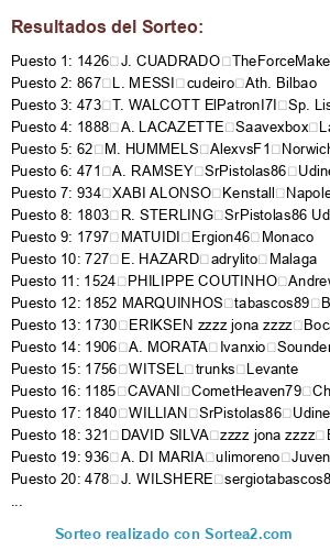 Lista de participantes: 20 ROBERTO FIRMINO Yelko100 Everton, 33 A. SCHURRLE perikinho90 Cordoba, 41 M. NEUER KaOs I AsTuR Oviedo, 43 J. BOATENG lorenbb Ol. Marsella, 45 P. LAHM alead71 Tottenham, 48 A. ROBBEN NandoBel78 Real Madrid, 49 T. MULLER tabascos89 Barcelona, 50 F. RIBERY alexhdz Fiorentina, 57 D. ALABA Havel7 Psg, 62 M. HUMMELS AlexvsF1 Norwich City, 66 M. GOTZE natadp Lugo, 74 R. LEWANDOWSKI pinolines Sevilla, 79 M. REUS Adriantr127 Atco. Madrid, 81 R. PEREYRA AndrewTorres Real Sociedad, 90 K. BELLARABI javitr Manchester City, 155 SOKRATIS ferminnn Nantes, 156 NALDO n0jan Cristal Palace, 244 P. CECH cudeiro Ath. Bilbao, 252 D. STURRIDGE MrMohamRam Liverpool, 254 MATA TATO XD Depor, 256 DAVID LUIZ misterserpico West Ham, 264 R. LUKAKU Platero17 Oporto, 279 P. POGBA Balles Malmoe, 305 L. SUAREZ xSAMU Benfica, 316 V. KOMPANY victub Valencia, 319 Y. TOURE Shaman1987 Cska, 321 DAVID SILVA zzzz jona zzzz Boca Juniors, 323 S. AGÜERO alemalaga94 Bayern Munich, 324 C. TEVEZ Nurhio Orlando City, 334 Y. KONOPLYANKA Balles Malmoe, 337 DE GEA n0jan Cristal Palace, 346 W. ROONEY Ergion46 Monaco, 347 J. HERNANDEZ ulimoreno Juventus, 378 A. TAARABT josegomisortega Aston Villa, 414 L. MODRIC josegomisortega Aston Villa, 415 G. BALE haankko888 Angeles Galaxy, 433 C. BEAUVUE Ergion46 Monaco, 471 A. RAMSEY SrPistolas86 Udinese, 473 T. WALCOTT ElPatronI7I Sp. Lisboa, 474 R. VAN PERSIE haankko888 Angeles Galaxy, 477 L. KOSCIELNY sergiotabascos89 Manchester United, 478 J. WILSHERE sergiotabascos89 Manchester United, 496 A. MARTIAL TheForceMaker Alcorcon, 584 OSCAR Platero17 Oporto, 604 NEYMAR DaniBke New York City, 609 LUCAS Saavexbox Las Palmas, 635 S. DOUMBIA Goss83 Schalke 04, 660 O. MARTINS Shaman1987 Cska, 727 E. HAZARD adrylito Malaga, 741 L. REMY pececillo1977 Ajax, 754 H. LLORIS alexhdz Fiorentina, 775 J. PASTORE Alex1493 Hamburgo, 778 S. SIRIGU AlexvsF1 Norwich City, 832 MUNIAIN susa16 Alaves, 844 FALCAO alemalaga94 Bayern Munich, 845 A. TURAN Viya88 Rayo Vallecano, 846 D. GODIN Viya88 Rayo Vallecano, 853 DIEGO COSTA danygp89 Bournomenth, 861 PIQUE SpiffiestJose Ol. Lyon, 863 SERGIO BUSQUETS haankko888 Angeles Galaxy, 865 CESC FABREGAS susa16 Alaves, 866 INIESTA pececillo1977 Ajax, 867 L. MESSI cudeiro Ath. Bilbao, 871 A. SANCHEZ sergiord14 Wolsfburgo, 872 THIAGO Ivanxio Sounders, 873 PEDRO natadp Lugo, 900 SANTI CAZORLA Nurhio Orlando City, 904 S. RONDON x chachiquesi x Betis, 906 ISCO misterserpico West Ham, 930 SERGIO RAMOS Goss83 Schalke 04, 933 MARCELO Adriantr127 Atco. Madrid, 934 XABI ALONSO Kenstall Napoles, 936 A. DI MARIA ulimoreno Juventus, 937 CRISTIANO RONALDO StormFury elche, 938 M. OZIL pinolines Sevilla, 939 K. BENZEMA Kenstall Napoles, 943 G. HIGUAIN Alex1493 Hamburgo, 948 JOSE CALLEJON StormFury elche, 979 I. RAKITIC iSugar v11 B. Moenchengladbach, 999 JORDI ALBA alemalaga94 Bayern Munich, 1028 THIAGO SILVA alead71 Tottenham, 1035 Z. IBRAHIMOVIC TATO XD Depor, 1075 A. CANDREVA MrMohamRam Liverpool, 1118 W. SNEIJDER NandoBel78 Real Madrid, 1136 G. CHIELLINI Yelko100 Everton, 1138 A. VIDAL merayombasogo Ponferradina, 1147 C. MARCHISIO Havel7 Psg, 1185 CAVANI CometHeaven79 Chelsea, 1217 M. PJANIC Alex1493 Hamburgo, 1251 N. OTAMENDI javitr Manchester City, 1255 HULK x chachiquesi x Betis, 1259 JAMES RODRIGUEZ iGosling V9 Arsenal, 1331 K. DE BRUYNE alexfcbarcelona B. Dortmund, 1426 J. CUADRADO TheForceMaker Alcorcon, 1524 PHILIPPE COUTINHO AndrewTorres Real Sociedad, 1610 N. MATIC CometHeaven79 Chelsea, 1619 P. AUBAMEYANG benniscuba Roma, 1668 D. MERTENS sergiord14 Wolsfburgo, 1729 PIRLO ElPatronI7I Sp. Lisboa, 1730 ERIKSEN zzzz jona zzzz Boca Juniors, 1732 JACKSON MARTINEZ AndrewTorres Real Sociedad, 1750 RAMIRES sergiotabascos89 Manchester United, 1753 KROOS iSugar v11 B. Moenchengladbach, 1755 C. VELA adrylito Malaga, 1756 WITSEL trunks Levante, 1757 GUNDOGAN danygp89 Bournomenth, 1758 R. NAINGGOLAN benniscuba Roma, 1784 T. COURTOIS SpiffiestJose Ol. Lyon, 1797 MATUIDI Ergion46 Monaco, 1803 R. STERLING SrPistolas86 Udinese, 1822 M. VERRATTI HaLiToxGCFx Granada, 1825 C. BENTEKE perikinho90 Cordoba, 1826 R. VARANE sergiotabascos89 Manchester United, 1840 WILLIAN SrPistolas86 Udinese, 1842 KOKE toni1708 Celta, 1852 MARQUINHOS tabascos89 Barcelona, 1858 B. LENO merayombasogo Ponferradina, 1879 A. ABDENNOUR alexfcbarcelona B. Dortmund, 1888 A. LACAZETTE Saavexbox Las Palmas, 1906 A. MORATA Ivanxio Sounders, 1907 A. GRIEZMANN x iReViiVaL FoX River Plate, 1933 P. DYBALA HaLiToxGCFx Granada, 1969 DOUGLAS COSTA trunks Levante, 1994 DEPAY Red Dutti B. Leverkusen, 2010 C. BACCA ferminnn Nantes, 2015 PACO ALCACER toni1708 Celta, 2017 L. VIETTO x iReViiVaL FoX River Plate, 2030 A. LAPORTE KaOs I AsTuR Oviedo.