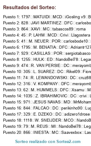 Lista de participantes: 41 M. NEUER POR carlosbode10 Ath. Bilbao, 43 J. BOATENG DFC tabascos89 Roma, 45 P. LAHM MCD Crivi Llagostera, 47 B. SCHWEINSTEIGER MC merayombasogo Boca Juniors, 48 A. ROBBEN MD Rikel09 Fiorentina, 49 T. MULLER MD ulimoreno Juventus, 50 F. RIBERY MI cometheaven79 elche, 51 M. GOMEZ DC javitr psg, 62 M. HUMMELS DFC Xsamu Manchester United, 66 M. GOTZE MCO misterserpico Sounders, 74 R. LEWANDOWSKI DC cruz88 Southend United, 79 M. REUS MI NandoBel78 Leganes, 112 J. FARFAN MD Pepitogrillo real Sociedad, 114 K. HUNTELAAR DC carlosbode10 Ath. Bilbao, 145 M. MANDZUKIC DC Red Dutti Granada, 244 P. CECH POR Havel7 Inter de Milan, 247 J. TERRY DFC SeaL KapO x Napoles, 252 D. STURRIDGE DC alemalaga94 Benfica, 254 MATA MCO angelitotabasco tottenham, 256 DAVID LUIZ DFC sergiotabascos89 Real Madrid, 262 ALEX DFC jesus022 Villarreal, 279 P. POGBA MC TheForceMaker Alcorcon, 301 S. GERRARD MCD jesusb Monaco, 305 L. SUAREZ DC Rikel09 Fiorentina, 316 V. KOMPANY DFC merayombasogo Boca Juniors, 319 Y. TOURE MC SpiffiestJose Celtic, 321 DAVID SILVA MCO iGosling v9 fcbarcelona, 322 S. NASRI MI Samue91 Betis, 323 S. AGÜERO DC perikinho90 Lugo, 324 C. TEVEZ DC x chachiquesi x Cordoba, 329 E. DZEKO DC adizero1drose America, 340 N. VIDIC DFC SSpecializeDD Manchester City, 346 W. ROONEY DC TheForceMaker alcorcon, 381 DIEGO COSTA DC buijin Atco. Madrid, 414 L. MODRIC MC adrylito Malaga, 415 G. BALE MD cudeiro B. Leverkusen, 467 P. MERTESACKER DFC pablotp48 B. Dortmund, 471 A. RAMSEY MC Rikel09 Fiorentina, 474 R. VAN PERSIE DC merayombasogo Boca Juniors, 584 OSCAR MCO marcoss1 Everton, 604 NEYMAR DC adrylito Malaga, 609 LUCAS ED adizero1drose America, 727 E. HAZARD MI tabascos89 Roma, 754 H. LLORIS POR javitr Psg, 828 JAVI MARTINEZ DFC carlosbode10 Ath. Bilbao, 844 FALCAO DC perikinho90 Lugo, 846 D. GODIN DFC ferminnn Ajax, 859 DANI ALVES LD merayombasogo Boca Juniors, 861 PIQUE DFC MrMohamRam Espanyol, 863 SERGIO BUSQUETS MCD Crivi Llagostera, 864 XAVI MC tabascos89 roma, 865 CESC FABREGAS MC Samue91 Betis, 866 INIESTA MC Saavexbox Las Palmas, 867 L. MESSI MP adrylito Malaga, 870 J. MASCHERANO MCD perikinho90 Lugo, 871 A. SANCHEZ ED sergiotabascos89 Real Madrid, 873 PEDRO EI iGosling v9 fcbarcelona, 897 J. TOULALAN MCD Saavexbox Las Palmas, 900 SANTI CAZORLA MI MrMohamRam Espanyol, 906 ISCO MCO misterserpico Sounders, 929 CASILLAS POR sergiotabascos89 Real Madrid, 930 SERGIO RAMOS DFC Rikel09 Fiorentina, 931 PEPE DFC carlosbode10 Ath. Bilbao, 934 XABI ALONSO MCD victub Valencia, 936 A. DI MARIA MCO ulimoreno Juventus, 937 CRISTIANO RONALDO EI TheForceMaker Alcorcon, 938 M. OZIL MCO Rikel09 Fiorentina, 939 K. BENZEMA DC Saavexbox Las Palmas, 943 G. HIGUAIN DC alemalaga94 Benfica, 944 S. KHEDIRA MCD Rikel09 Fiorentina, 971 JESUS NAVAS MD MrMohamRam Espanyol, 976 A. NEGREDO DC jesub Monaco, 979 I. RAKITIC MCO tabascos89 Roma, 1028 THIAGO SILVA DFC ferminnn Ajax, 1035 Z. IBRAHIMOVIC DC crivi Llagostera, 1075 A. CANDREVA ED javitr psg, 1118 W. SNEIJDER MCO NandoBel78 Leganes, 1122 T. MOTTA MCD jesus022 Villarreal, 1135 A. BARZAGLI DFC jesus022 Villarreal, 1136 G. CHIELLINI DFC perikinho90 Lugo, 1138 A. VIDAL MC alemalaga94 Benfica, 1184 E. LAVEZZI EI alemalaga94 Benfica, 1185 E. CAVANI DC victub Valencia, 1217 M. PJANIC MC Havel7 Inter de Milan, 1254 JOAO MOUTINHO MC NandoBel78 Leganes, 1255 HULK ED NandoBel78 Leganes, 1259 JAMES RODRIGUEZ MCO victub Valencia, 1277 E. GARAY DFC Saavexbox Las Palmas, 1426 J. CUADRADO MD ulimoreno Juventus, 1724 DE ROSSI MCD adrylito Malaga, 1729 PIRLO MC javicobarro Sp. Gijon, 1730 ERIKSEN MI Samue91 Betis, 1744 HAMSIK MCO Havel7 Inter de Milan, 1753 KROOS MC Pepitogrillo real Sociedad, 1757 GUNDOGAN MC crivi Llagostera, 1766 MARCHISIO MC adrylito Malaga, 1784 T. COURTOIS POR Adriantr127 Arsenal, 1795 M. BENATIA DFC Adriantr127 Arsenal, 1796 MIRANDA DFC adrylito Malaga, 1797 MATUIDI MCD iGosling v9 Barcelona.