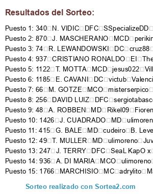 Lista de participantes: 41 M. NEUER POR carlosbode10 Ath. Bilbao, 43 J. BOATENG DFC tabascos89 Roma, 45 P. LAHM MCD Crivi Llagostera, 47 B. SCHWEINSTEIGER MC merayombasogo Boca Juniors, 48 A. ROBBEN MD Rikel09 Fiorentina, 49 T. MULLER MD ulimoreno Juventus, 50 F. RIBERY MI cometheaven79 elche, 51 M. GOMEZ DC javitr psg, 62 M. HUMMELS DFC Xsamu Manchester United, 66 M. GOTZE MCO misterserpico Sounders, 74 R. LEWANDOWSKI DC cruz88 Southend United, 79 M. REUS MI NandoBel78 Leganes, 112 J. FARFAN MD Pepitogrillo real Sociedad, 114 K. HUNTELAAR DC carlosbode10 Ath. Bilbao, 145 M. MANDZUKIC DC Red Dutti Granada, 244 P. CECH POR Havel7 Inter de Milan, 247 J. TERRY DFC SeaL KapO x Napoles, 252 D. STURRIDGE DC alemalaga94 Benfica, 254 MATA MCO angelitotabasco tottenham, 256 DAVID LUIZ DFC sergiotabascos89 Real Madrid, 262 ALEX DFC jesus022 Villarreal, 279 P. POGBA MC TheForceMaker Alcorcon, 301 S. GERRARD MCD jesusb Monaco, 305 L. SUAREZ DC Rikel09 Fiorentina, 316 V. KOMPANY DFC merayombasogo Boca Juniors, 319 Y. TOURE MC SpiffiestJose Celtic, 321 DAVID SILVA MCO iGosling v9 fcbarcelona, 322 S. NASRI MI Samue91 Betis, 323 S. AGÜERO DC perikinho90 Lugo, 324 C. TEVEZ DC x chachiquesi x Cordoba, 329 E. DZEKO DC adizero1drose America, 340 N. VIDIC DFC SSpecializeDD Manchester City, 346 W. ROONEY DC TheForceMaker alcorcon, 381 DIEGO COSTA DC buijin Atco. Madrid, 414 L. MODRIC MC adrylito Malaga, 415 G. BALE MD cudeiro B. Leverkusen, 467 P. MERTESACKER DFC pablotp48 B. Dortmund, 471 A. RAMSEY MC Rikel09 Fiorentina, 474 R. VAN PERSIE DC merayombasogo Boca Juniors, 584 OSCAR MCO marcoss1 Everton, 604 NEYMAR DC adrylito Malaga, 609 LUCAS ED adizero1drose America, 727 E. HAZARD MI tabascos89 Roma, 754 H. LLORIS POR javitr Psg, 828 JAVI MARTINEZ DFC carlosbode10 Ath. Bilbao, 844 FALCAO DC perikinho90 Lugo, 846 D. GODIN DFC ferminnn Ajax, 859 DANI ALVES LD merayombasogo Boca Juniors, 861 PIQUE DFC MrMohamRam Espanyol, 863 SERGIO BUSQUETS MCD Crivi Llagostera, 864 XAVI MC tabascos89 roma, 865 CESC FABREGAS MC Samue91 Betis, 866 INIESTA MC Saavexbox Las Palmas, 867 L. MESSI MP adrylito Malaga, 870 J. MASCHERANO MCD perikinho90 Lugo, 871 A. SANCHEZ ED sergiotabascos89 Real Madrid, 873 PEDRO EI iGosling v9 fcbarcelona, 897 J. TOULALAN MCD Saavexbox Las Palmas, 900 SANTI CAZORLA MI MrMohamRam Espanyol, 906 ISCO MCO misterserpico Sounders, 929 CASILLAS POR sergiotabascos89 Real Madrid, 930 SERGIO RAMOS DFC Rikel09 Fiorentina, 931 PEPE DFC carlosbode10 Ath. Bilbao, 934 XABI ALONSO MCD victub Valencia, 936 A. DI MARIA MCO ulimoreno Juventus, 937 CRISTIANO RONALDO EI TheForceMaker Alcorcon, 938 M. OZIL MCO Rikel09 Fiorentina, 939 K. BENZEMA DC Saavexbox Las Palmas, 943 G. HIGUAIN DC alemalaga94 Benfica, 944 S. KHEDIRA MCD Rikel09 Fiorentina, 971 JESUS NAVAS MD MrMohamRam Espanyol, 976 A. NEGREDO DC jesub Monaco, 979 I. RAKITIC MCO tabascos89 Roma, 1028 THIAGO SILVA DFC ferminnn Ajax, 1035 Z. IBRAHIMOVIC DC crivi Llagostera, 1075 A. CANDREVA ED javitr psg, 1118 W. SNEIJDER MCO NandoBel78 Leganes, 1122 T. MOTTA MCD jesus022 Villarreal, 1135 A. BARZAGLI DFC jesus022 Villarreal, 1136 G. CHIELLINI DFC perikinho90 Lugo, 1138 A. VIDAL MC alemalaga94 Benfica, 1184 E. LAVEZZI EI alemalaga94 Benfica, 1185 E. CAVANI DC victub Valencia, 1217 M. PJANIC MC Havel7 Inter de Milan, 1254 JOAO MOUTINHO MC NandoBel78 Leganes, 1255 HULK ED NandoBel78 Leganes, 1259 JAMES RODRIGUEZ MCO victub Valencia, 1277 E. GARAY DFC Saavexbox Las Palmas, 1426 J. CUADRADO MD ulimoreno Juventus, 1724 DE ROSSI MCD adrylito Malaga, 1729 PIRLO MC javicobarro Sp. Gijon, 1730 ERIKSEN MI Samue91 Betis, 1744 HAMSIK MCO Havel7 Inter de Milan, 1753 KROOS MC Pepitogrillo real Sociedad, 1757 GUNDOGAN MC crivi Llagostera, 1766 MARCHISIO MC adrylito Malaga, 1784 T. COURTOIS POR Adriantr127 Arsenal, 1795 M. BENATIA DFC Adriantr127 Arsenal, 1796 MIRANDA DFC adrylito Malaga, 1797 MATUIDI MCD iGosling v9 Barcelona.