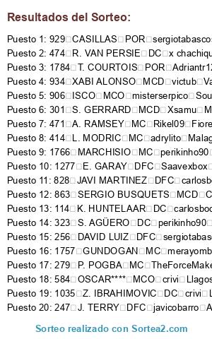 Lista de participantes: 41 M. NEUER POR carlosbode10 Ath. Bilbao, 43 J. BOATENG DFC tabascos89 Roma, 45 P. LAHM MCD TheForceMaker Alcorcon, 47 B. SCHWEINSTEIGER MC Saavexbox Las Palmas, 48 A. ROBBEN MD Rikel09 Fiorentina, 49 T. MULLER MD ulimoreno Juventus, 50 F. RIBERY MI misterserpico Sounders, 51 M. GOMEZ DC javitr Racing Santander, 62 M. HUMMELS DFC Xsamu Manchester United, 66 M. GOTZE**** MCO misterserpico Sounders, 74 R. LEWANDOWSKI**** DC cruz88 Southend, 79 M. REUS MI NandoBel78 Leganes, 112 J. FARFAN MD perikinho90 lugo, 114 K. HUNTELAAR DC carlosbode10 Ath. Bilbao, 145 M. MANDZUKIC DC igosling Barcelona, 244 P. CECH POR Havel7 Inter de Milan, 247 J. TERRY DFC javicobarro Ac Milan, 252 D. STURRIDGE DC alemalaga94 benfica, 254 MATA MCO KaOs I AsTuR Tottenham, 256 DAVID LUIZ DFC sergiotabascos89 Real Madrid, 262 ALEX DFC jesus022 Villarreal, 279 P. POGBA MC TheForceMaker Alcorcon, 301 S. GERRARD MCD Xsamu Manchester United, 305 L. SUAREZ DC Rikel09 Fiorentina, 316 V. KOMPANY DFC ferminnn Ajax, 319 Y. TOURE MC pinolines Celtic, 321 DAVID SILVA MCO sergiotabascos89 Real Madrid, 322 S. NASRI MI lorenbb Betis, 323 S. AGÜERO DC perikinho90 Lugo, 324 C. TEVEZ DC x chachiquesi x Cordoba, 329 E. DZEKO DC adizero1drose America, 340 N. VIDIC DFC SSpecializeDD Manchester City, 346 W. ROONEY**** DC NandoBel78 Leganes, 381 DIEGO COSTA DC buijin Atco. Madrid, 414 L. MODRIC MC adrylito Malaga, 415 G. BALE MD cudeiro B. Leverkusen, 467 P. MERTESACKER DFC Saavexbox Las Palmas, 471 A. RAMSEY MC Rikel09 Fiorentina, 474 R. VAN PERSIE DC x chachiquesi x Cordoba, 584 OSCAR**** MCO crivi Llagostera, 604 NEYMAR**** DC adrylito Malaga, 609 LUCAS ED adizero1drose America, 727 E. HAZARD MI tabascos89 Roma, 754 H. LLORIS POR javitr Psg, 828 JAVI MARTINEZ DFC carlosbode10 Ath. Bilbao, 844 FALCAO DC perikinho90 Lugo, 846 D. GODIN**** DFC merayombasogo Boca Juniors, 859 DANI ALVES LD merayombasogo Boca Juniors, 861 PIQUE DFC MrMohamRam Espanyol, 863 SERGIO BUSQUETS MCD Crivi Llagostera, 864 XAVI MC tabascos89 Roma, 865 CESC FABREGAS MC lorenbb Betis, 866 INIESTA MC merayombasogo Boca Juniors, 867 L. MESSI MP adrylito Malaga, 870 J. MASCHERANO MCD perikinho90 Lugo, 871 A. SANCHEZ ED sergiotabascos89 Real Madrid, 873 PEDRO EI Saavexbox Las Palmas, 897 J. TOULALAN MCD pablotp48 B. Dortmund, 900 SANTI CAZORLA MI MrMohamRam Espanyol, 906 ISCO MCO misterserpico Sounders, 929 CASILLAS POR sergiotabascos89 Real Madrid, 930 SERGIO RAMOS DFC Rikel09 Fiorentina, 931 PEPE DFC carlosbode10 Ath. Bilbao, 934 XABI ALONSO MCD victub Valencia, 936 A. DI MARIA MCO ulimoreno Juventus, 937 CRISTIANO RONALDO EI TheForceMaker Alcorcon, 938 M. OZIL**** MCO Rikel09 Fiorentina, 939 K. BENZEMA DC Saavexbox Las Palmas, 943 G. HIGUAIN DC alemalaga94 Benfica, 944 S. KHEDIRA MCD Rikel09 Fiorentina, 971 JESUS NAVAS MD MrMohamRam Espanyol, 976 A. NEGREDO DC jesub Monaco, 979 I. RAKITIC MCO TATO XD Depor, 1028 THIAGO SILVA DFC ferminnn Ajax, 1035 Z. IBRAHIMOVIC DC crivi Llagostera, 1075 A. CANDREVA ED javitr Racing Santander, 1118 W. SNEIJDER MCO NandoBel78 Leganes, 1122 T. MOTTA MCD SSpecializeDD Manchester City, 1135 A. BARZAGLI DFC jesus022 Villarreal, 1136 G. CHIELLINI DFC perikinho90 Lugo, 1138 A. VIDAL MC alemalaga94 benfica, 1184 E. LAVEZZI EI alemalaga94 benfica, 1185 E. CAVANI DC victub Valencia, 1217 M. PJANIC MC Havel7 Inter de Milan, 1254 JOAO MOUTINHO MC NandoBel78 Leganes, 1255 HULK*** ED TheForceMaker Alcorcon, 1259 JAMES RODRIGUEZ MCO victub Valencia, 1277 E. GARAY DFC Saavexbox Las Palmas, 1426 J. CUADRADO MD ulimoreno Juventus, 1724 DE ROSSI MCD adrylito Malaga, 1729 PIRLO MC javicobarro Ac Milan, 1730 ERIKSEN MI lorenbb Betis, 1744 HAMSIK MCO Havel7 Inter de Milan, 1753 KROOS MC javitr Racing Santander, 1757 GUNDOGAN MC merayombasogo Boca Juniors, 1766 MARCHISIO MC perikinho90 Lugo, 1784 T. COURTOIS POR Adriantr127 Arsenal, 1795 M. BENATIA DFC Adriantr127 Arsenal, 1796 MIRANDA DFC igosling Barcelona, 1797 MATUIDI MCD igosling Barcelona.